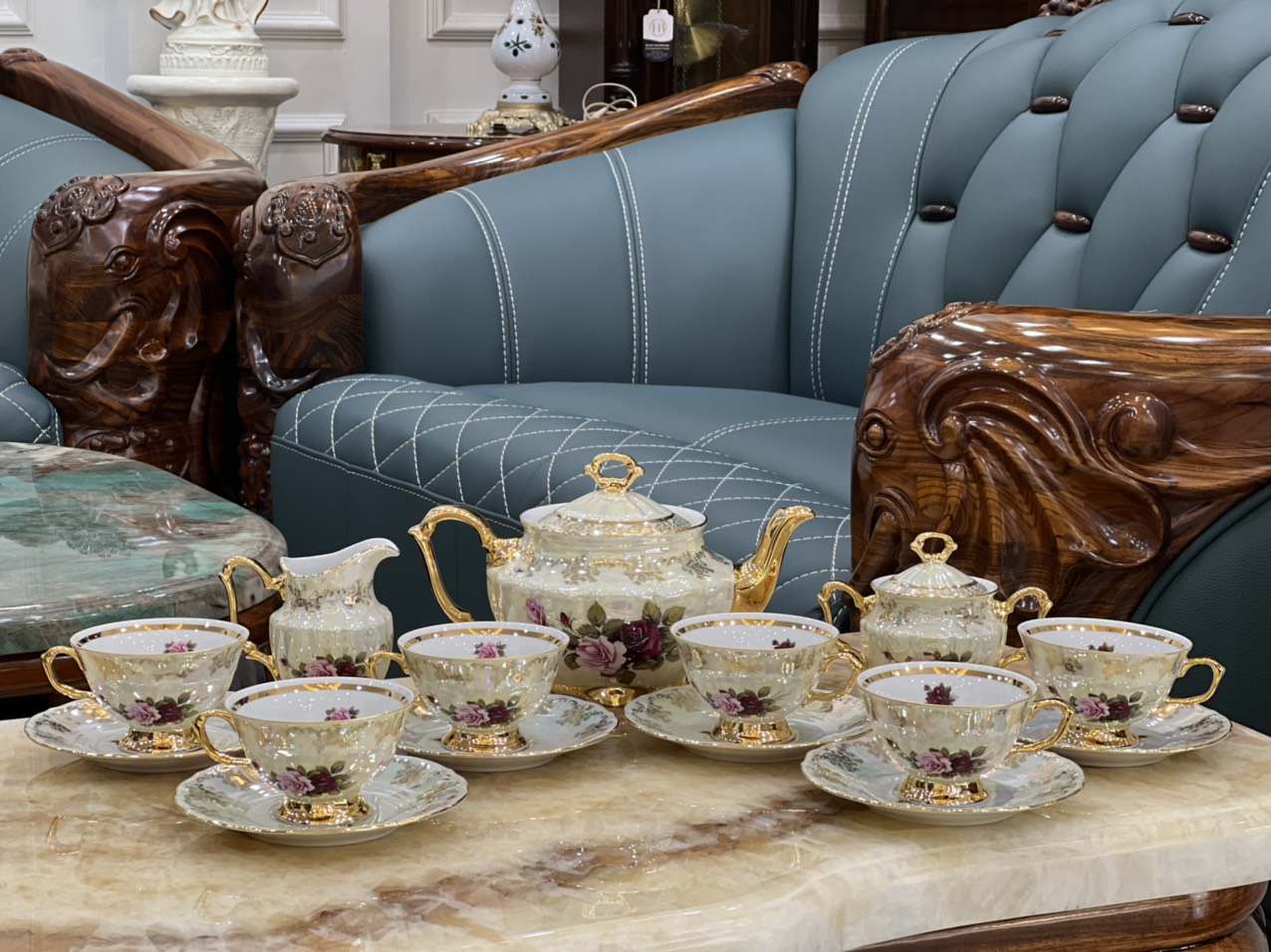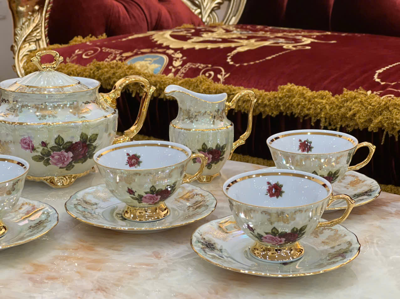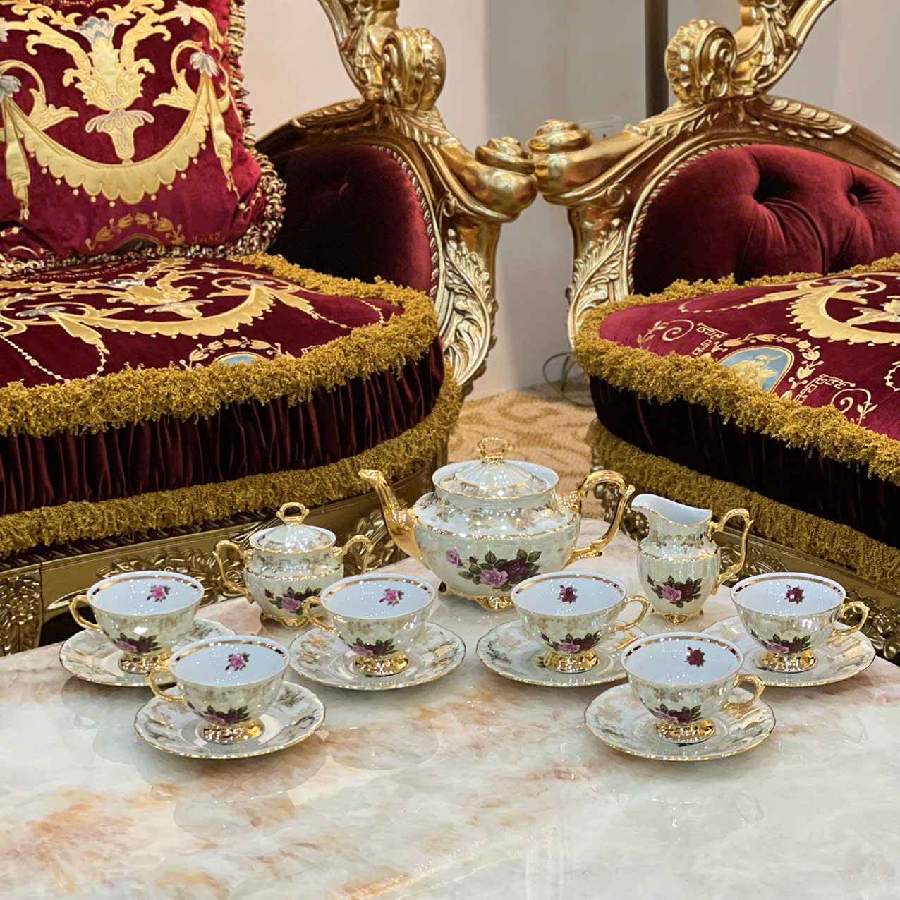 Bộ sản phẩm bao gồm: - 01 Ấm trà phong cách Châu Âu sang trọng. Quai ấm và vòi ấm mạ vàng tinh tế. - 01 Hũ đường có nắp đậy, hoa văn tinh xảo, phù hợp với các buổi trà chiều của văn hóa phương Tây. - 06 Chén trà tráng men tinh tế, bề mặt nhẵn mịn, tay cầm uốn cong vẽ vàng vô cùng mềm mại. - 01 Chén rót mật ong họa tiết viền vàng tinh tế. - 06 Đĩa nhỏ mỏng nhẹ, thiết kế đáy lõm vừa vặn với chén. • Bộ ấm trà phong cách tân cổ điển là món đồ sang trọng và tinh tế không thể thiếu trong mỗi không gian sang trọng trong các Căn Biệt thự, Dinh thự, Nhà Hàng và Khách sạn 5*, Chung cư cao cấp, … Nó vừa là đồ dùng để tiếp khách, vừa là đồ dùng để trang trí đẹp. Ngoài ra, một bộ ấm chén đẹp còn là quà biếu tặng hoàn hảo và ý nghĩa dành cho người thân, bạn bè, khách hàng, đối tác, sếp, tân gia, khai trương, cưới hỏi,...