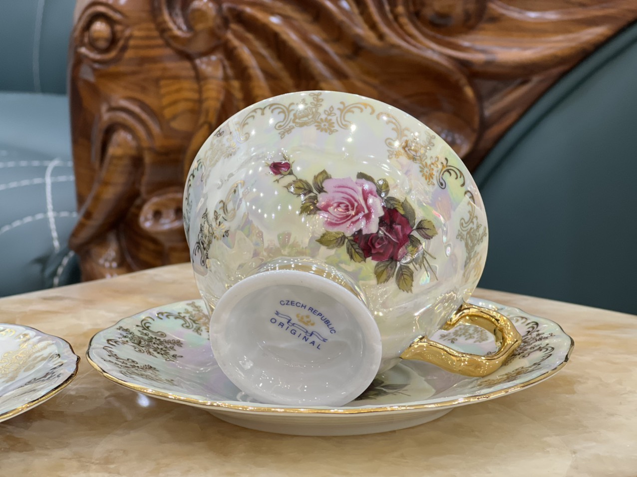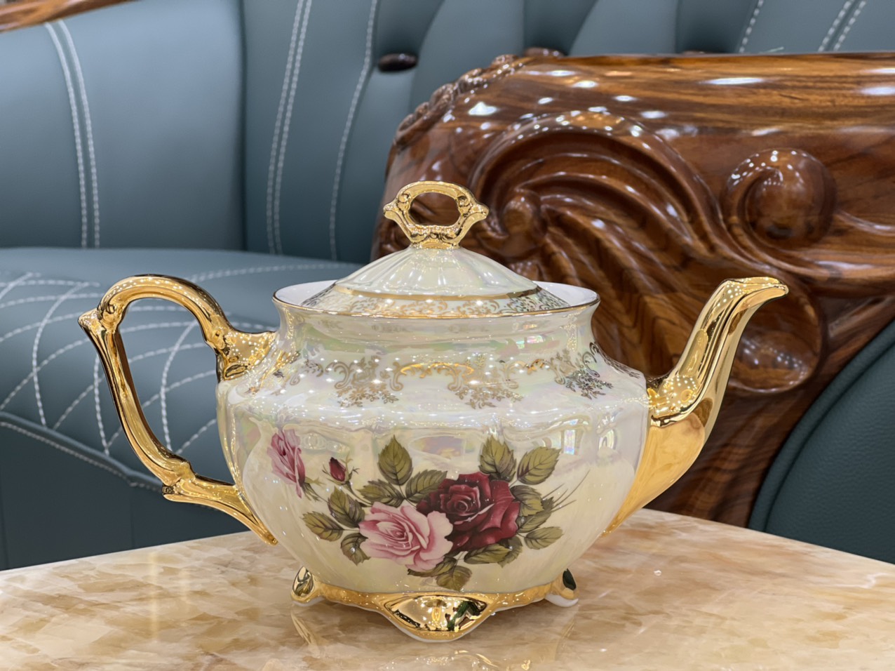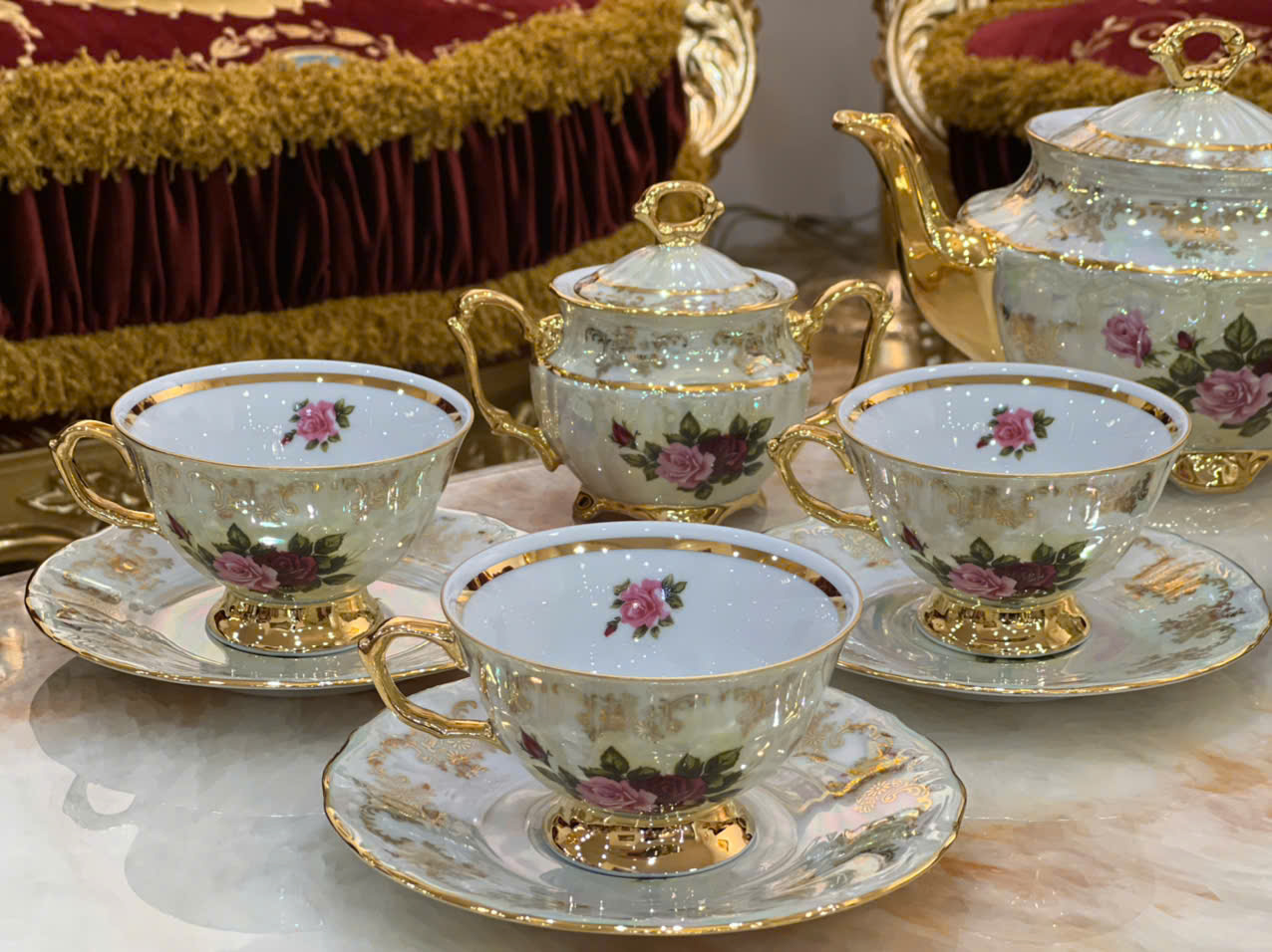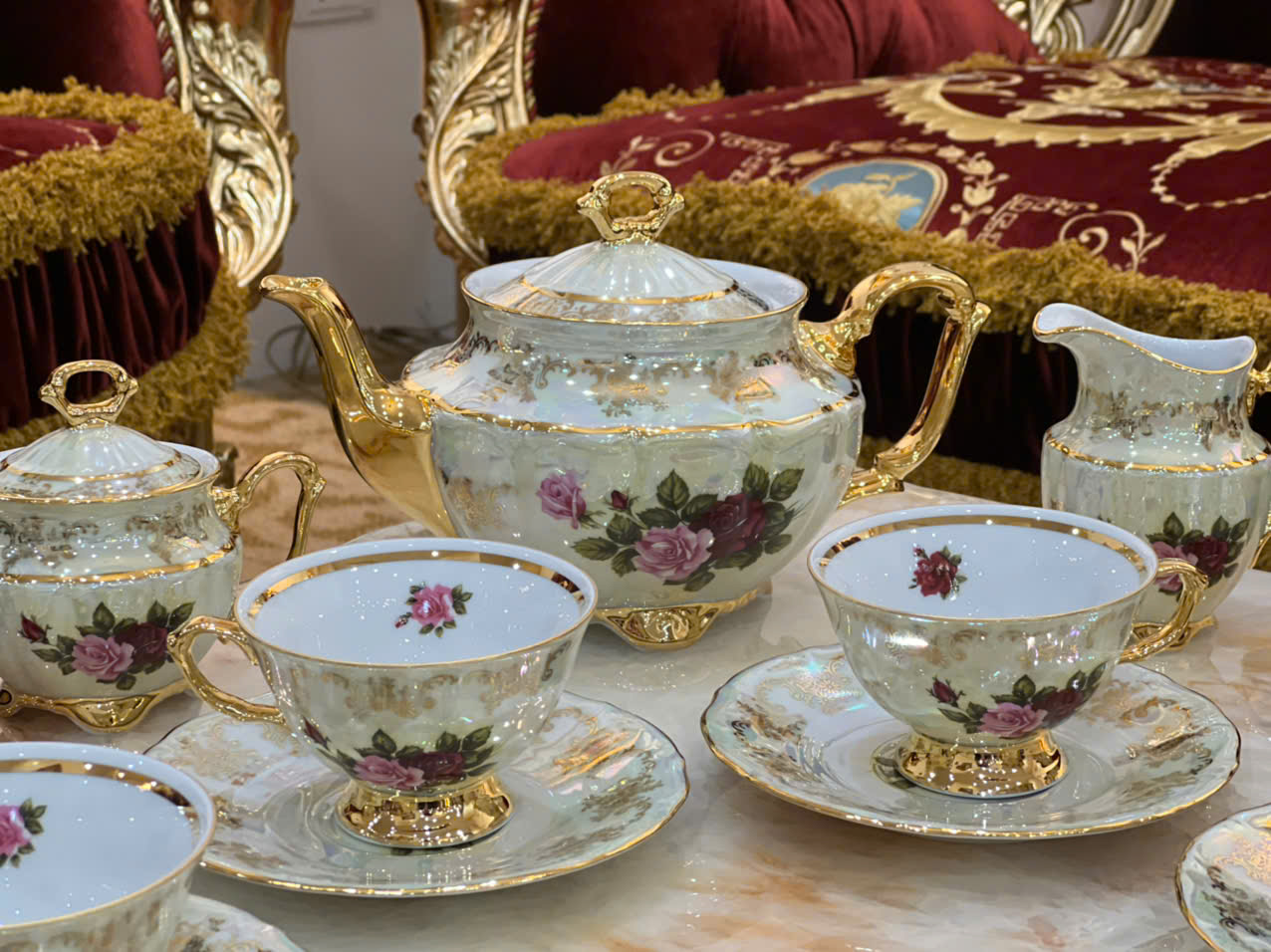 Bộ sản phẩm bao gồm: - 01 Ấm trà phong cách Châu Âu sang trọng. Quai ấm và vòi ấm mạ vàng tinh tế. - 01 Hũ đường có nắp đậy, hoa văn tinh xảo, phù hợp với các buổi trà chiều của văn hóa phương Tây. - 06 Chén trà tráng men tinh tế, bề mặt nhẵn mịn, tay cầm uốn cong vẽ vàng vô cùng mềm mại. - 01 Chén rót mật ong họa tiết viền vàng tinh tế. - 06 Đĩa nhỏ mỏng nhẹ, thiết kế đáy lõm vừa vặn với chén. • Bộ ấm trà phong cách tân cổ điển là món đồ sang trọng và tinh tế không thể thiếu trong mỗi không gian sang trọng trong các Căn Biệt thự, Dinh thự, Nhà Hàng và Khách sạn 5*, Chung cư cao cấp, … Nó vừa là đồ dùng để tiếp khách, vừa là đồ dùng để trang trí đẹp. Ngoài ra, một bộ ấm chén đẹp còn là quà biếu tặng hoàn hảo và ý nghĩa dành cho người thân, bạn bè, khách hàng, đối tác, sếp, tân gia, khai trương, cưới hỏi,...