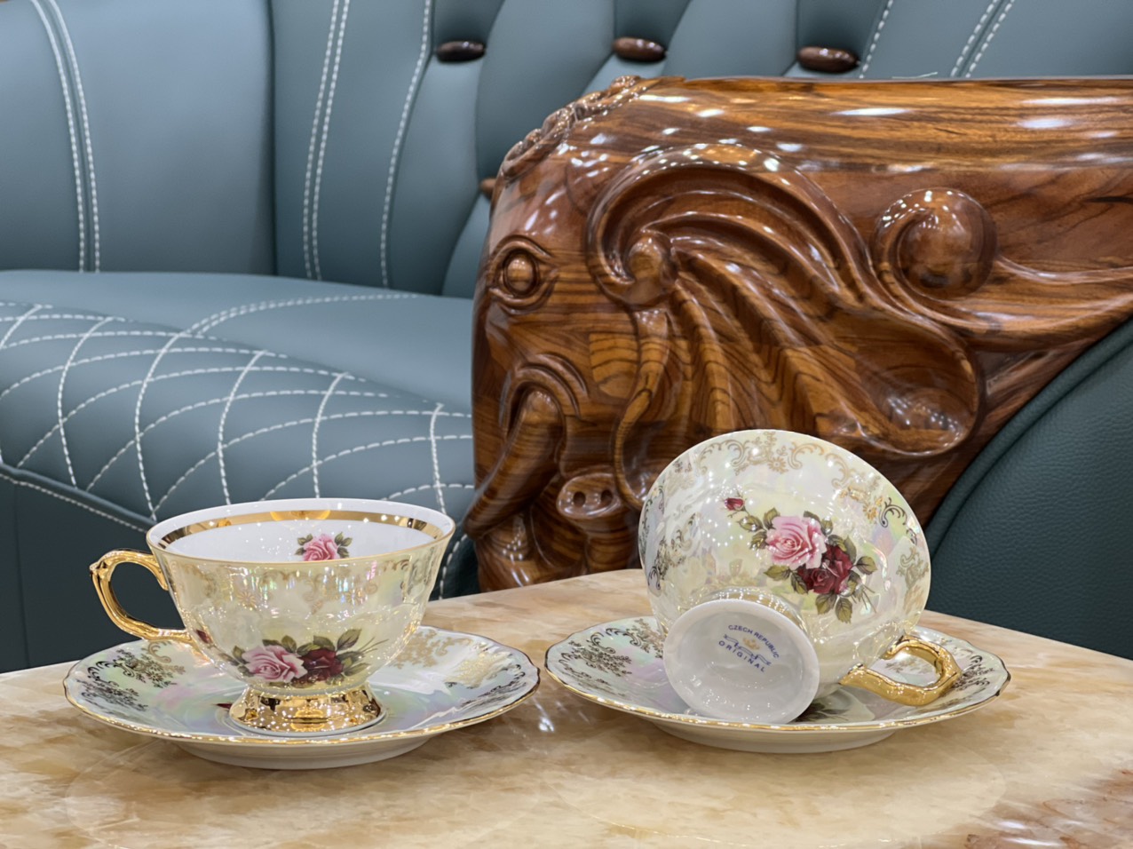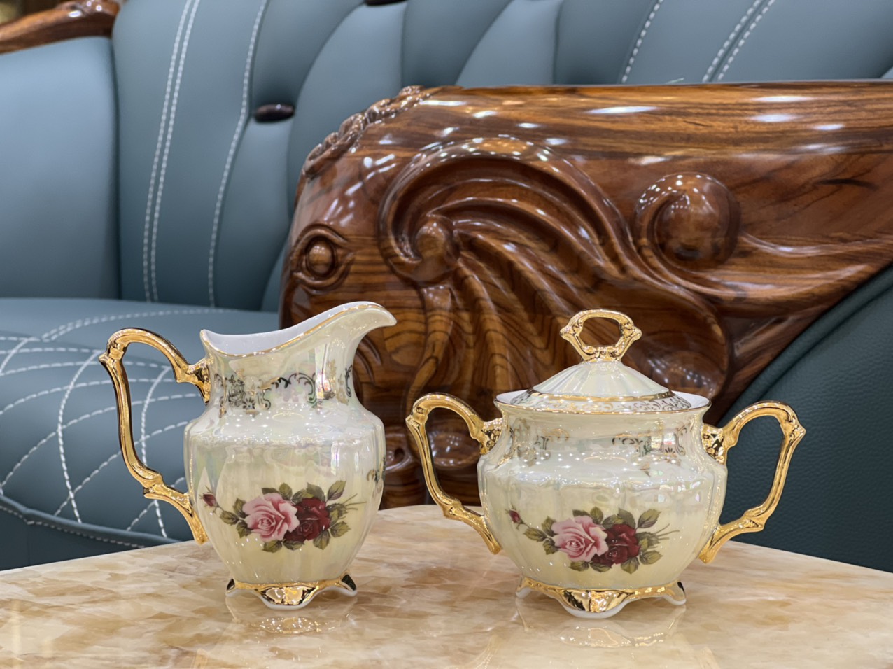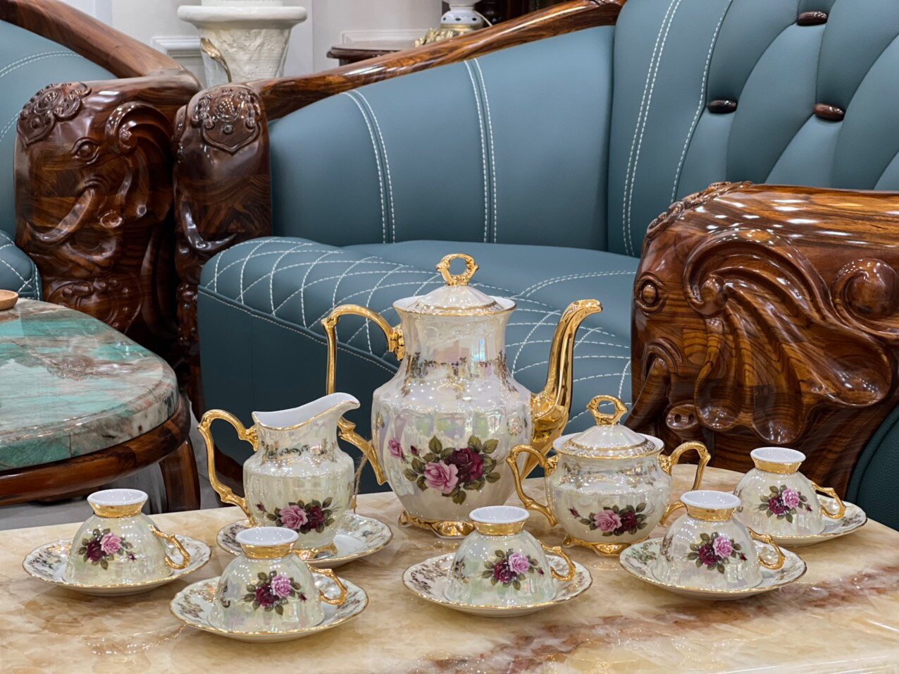 Bộ sản phẩm bao gồm: - 01 Ấm trà phong cách Châu Âu sang trọng. Quai ấm và vòi ấm mạ vàng tinh tế. - 01 Hũ đường có nắp đậy, hoa văn tinh xảo, phù hợp với các buổi trà chiều của văn hóa phương Tây. - 06 Chén trà tráng men tinh tế, bề mặt nhẵn mịn, tay cầm uốn cong vẽ vàng vô cùng mềm mại. - 01 Chén rót mật ong họa tiết viền vàng tinh tế. - 06 Đĩa nhỏ mỏng nhẹ, thiết kế đáy lõm vừa vặn với chén. • Bộ ấm trà phong cách tân cổ điển là món đồ sang trọng và tinh tế không thể thiếu trong mỗi không gian sang trọng trong các Căn Biệt thự, Dinh thự, Nhà Hàng và Khách sạn 5*, Chung cư cao cấp, … Nó vừa là đồ dùng để tiếp khách, vừa là đồ dùng để trang trí đẹp. Ngoài ra, một bộ ấm chén đẹp còn là quà biếu tặng hoàn hảo và ý nghĩa dành cho người thân, bạn bè, khách hàng, đối tác, sếp, tân gia, khai trương, cưới hỏi,