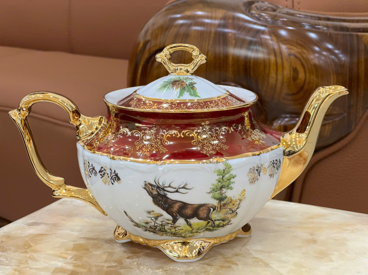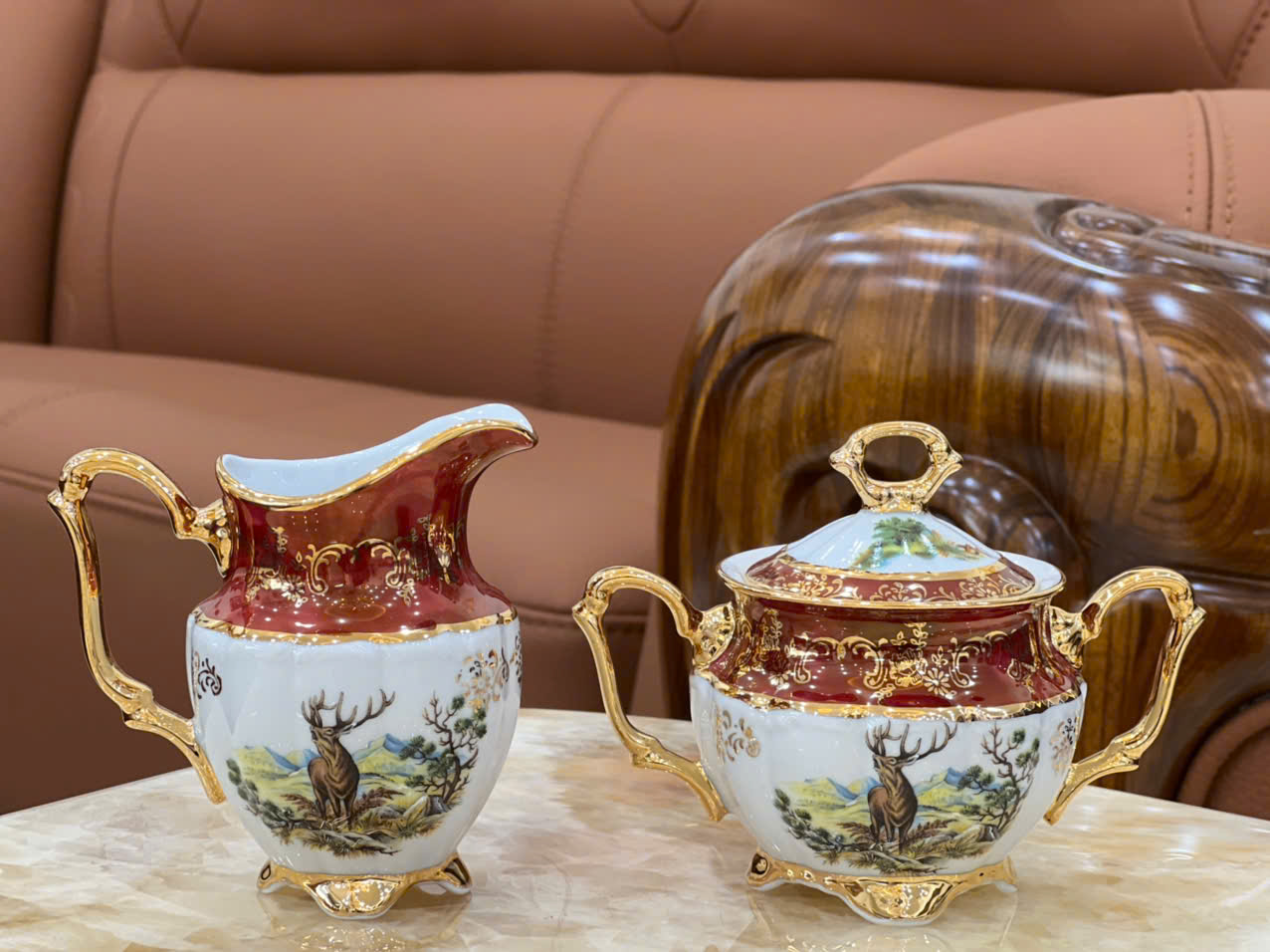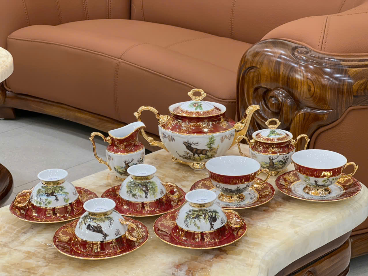Bộ sản phẩm bao gồm: - 01 Ấm trà phong cách Châu Âu sang trọng. Quai ấm và vòi ấm mạ vàng tinh tế. - 01 Hũ đường có nắp đậy, hoa văn tinh xảo, phù hợp với các buổi trà chiều của văn hóa phương Tây. - 06 Chén trà tráng men tinh tế, bề mặt nhẵn mịn, tay cầm uốn cong vẽ vàng vô cùng mềm mại. - 01 Chén rót mật ong họa tiết viền vàng tinh tế. - 06 Đĩa nhỏ mỏng nhẹ, thiết kế đáy lõm vừa vặn với chén. • Bộ ấm trà phong cách tân cổ điển là món đồ sang trọng và tinh tế không thể thiếu trong mỗi không gian sang trọng trong các Căn Biệt thự, Dinh thự, Nhà Hàng và Khách sạn 5*, Chung cư cao cấp, … Nó vừa là đồ dùng để tiếp khách, vừa là đồ dùng để trang trí đẹp. Ngoài ra, một bộ ấm chén đẹp còn là quà biếu tặng hoàn hảo và ý nghĩa dành cho người thân, bạn bè, khách hàng, đối tác, sếp, tân gia, khai trương, cưới hỏi,...