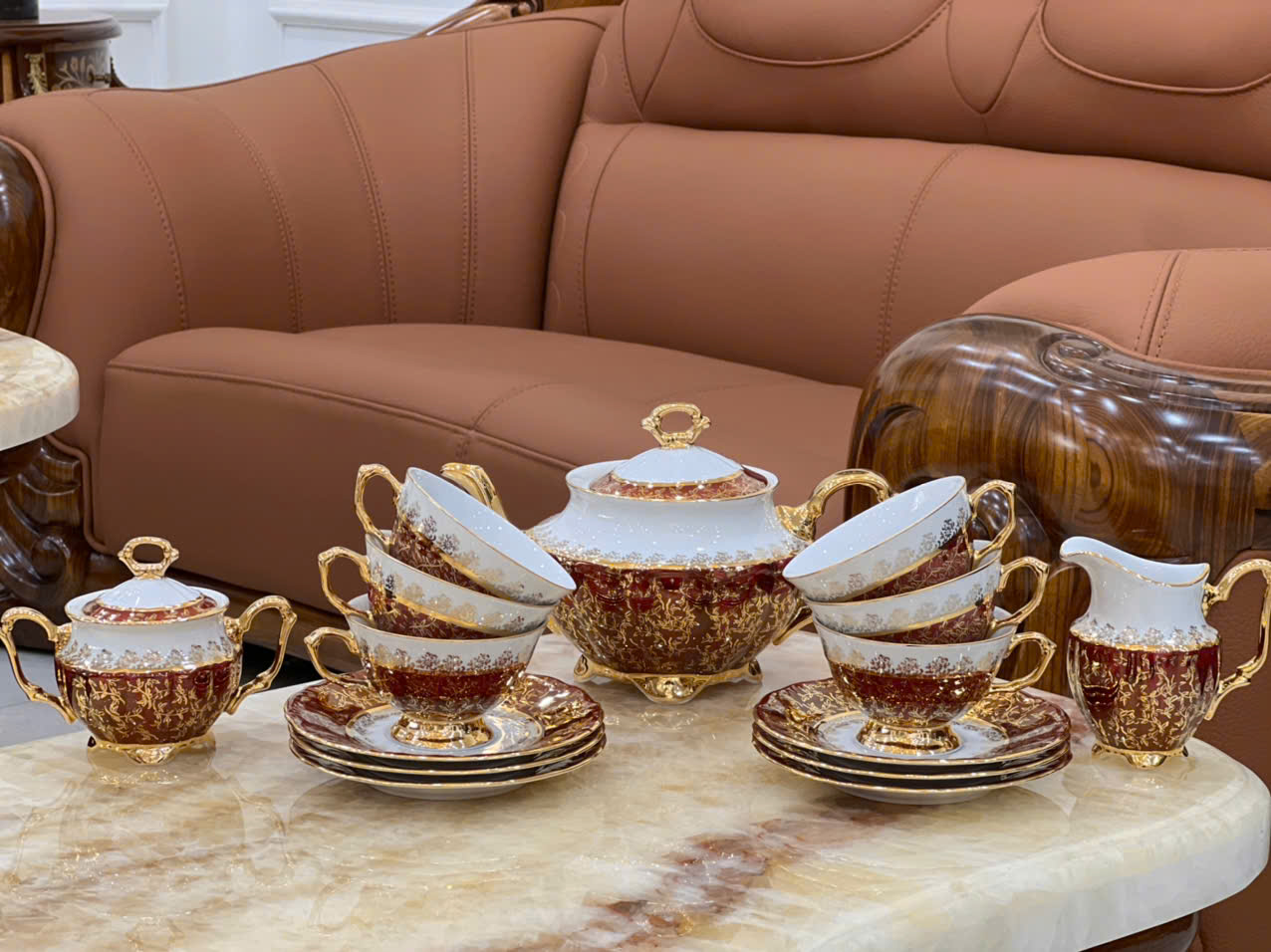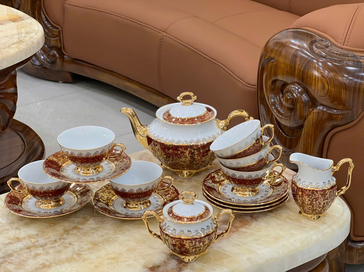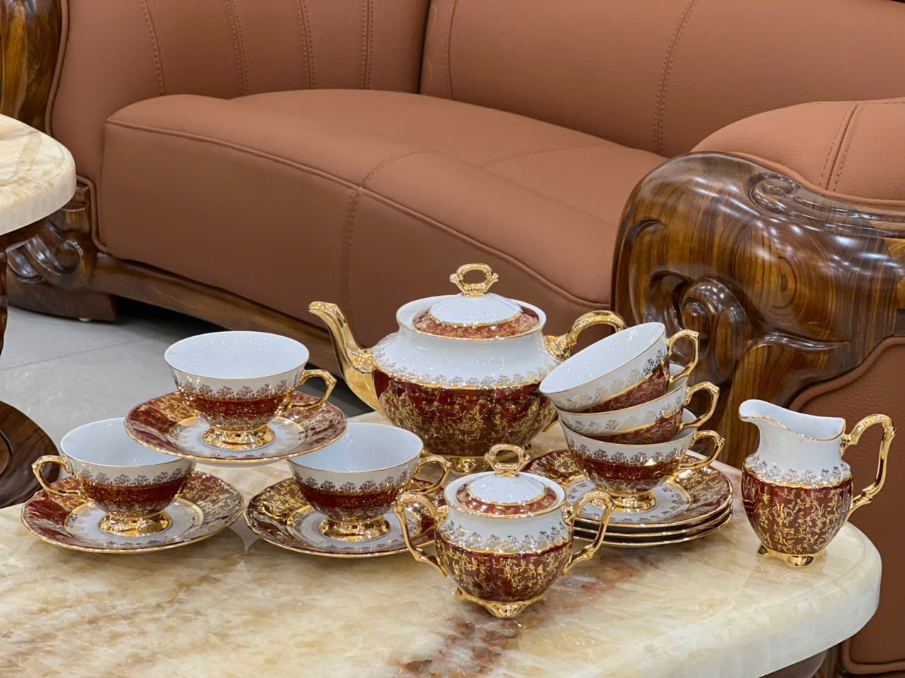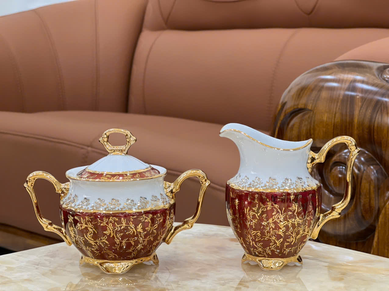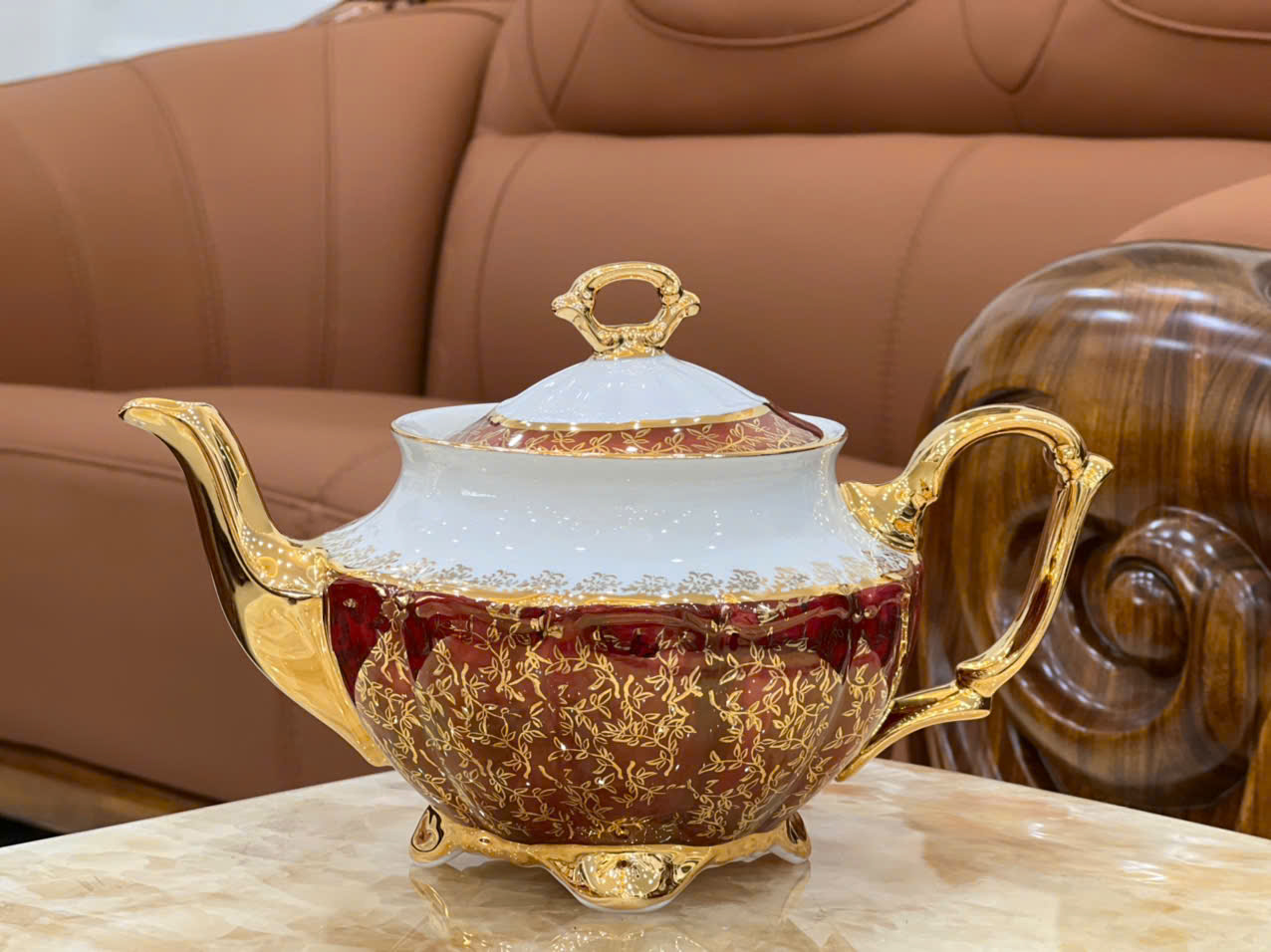 Bộ sản phẩm bao gồm: - 01 Ấm trà phong cách Châu Âu sang trọng. Quai ấm và vòi ấm mạ vàng tinh tế. - 01 Hũ đường có nắp đậy, hoa văn tinh xảo, phù hợp với các buổi trà chiều của văn hóa phương Tây. - 06 Chén trà tráng men tinh tế, bề mặt nhẵn mịn, tay cầm uốn cong vẽ vàng vô cùng mềm mại. - 01 Chén rót mật ong họa tiết viền vàng tinh tế. - 06 Đĩa nhỏ mỏng nhẹ, thiết kế đáy lõm vừa vặn với chén. • Bộ ấm trà phong cách tân cổ điển là món đồ sang trọng và tinh tế không thể thiếu trong mỗi không gian sang trọng trong các Căn Biệt thự, Dinh thự, Nhà Hàng và Khách sạn 5*, Chung cư cao cấp, … Nó vừa là đồ dùng để tiếp khách, vừa là đồ dùng để trang trí đẹp. Ngoài ra, một bộ ấm chén đẹp còn là quà biếu tặng hoàn hảo và ý nghĩa dành cho người thân, bạn bè, khách hàng, đối tác, sếp, tân gia, khai trương, cưới hỏi,...