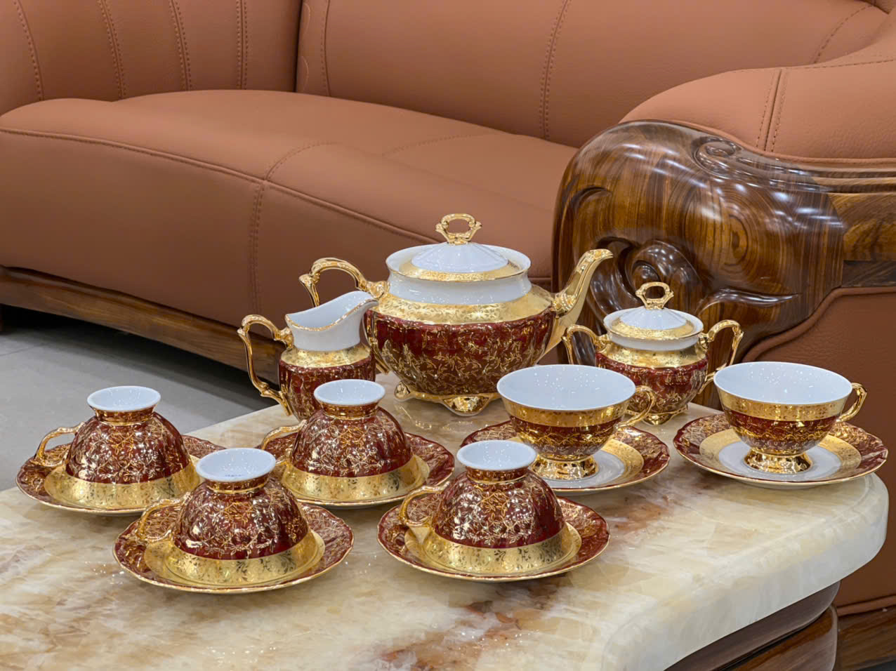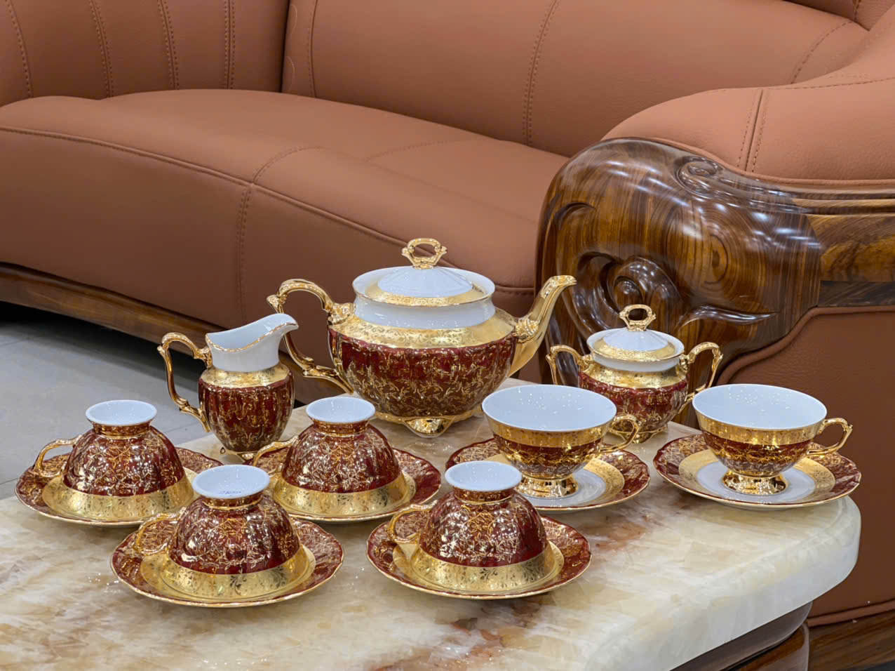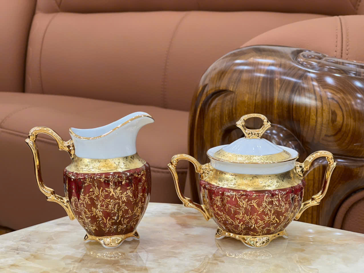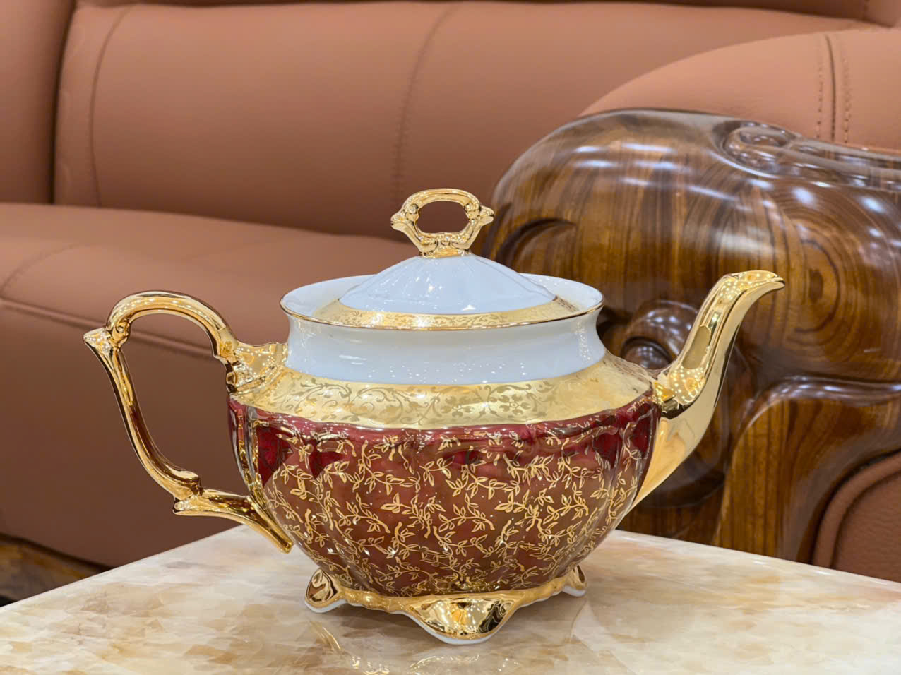 Bộ sản phẩm bao gồm: - 01 Ấm trà phong cách Châu Âu sang trọng. Quai ấm và vòi ấm mạ vàng tinh tế. - 01 Hũ đường có nắp đậy, hoa văn tinh xảo, phù hợp với các buổi trà chiều của văn hóa phương Tây. - 06 Chén trà tráng men tinh tế, bề mặt nhẵn mịn, tay cầm uốn cong vẽ vàng vô cùng mềm mại. - 01 Chén rót mật ong họa tiết viền vàng tinh tế. - 06 Đĩa nhỏ mỏng nhẹ, thiết kế đáy lõm vừa vặn với chén. • Bộ ấm trà phong cách tân cổ điển là món đồ sang trọng và tinh tế không thể thiếu trong mỗi không gian sang trọng trong các Căn Biệt thự, Dinh thự, Nhà Hàng và Khách sạn 5*, Chung cư cao cấp, … Nó vừa là đồ dùng để tiếp khách, vừa là đồ dùng để trang trí đẹp. Ngoài ra, một bộ ấm chén đẹp còn là quà biếu tặng hoàn hảo và ý nghĩa dành cho người thân, bạn bè, khách hàng, đối tác, sếp, tân gia, khai trương, cưới hỏi,...