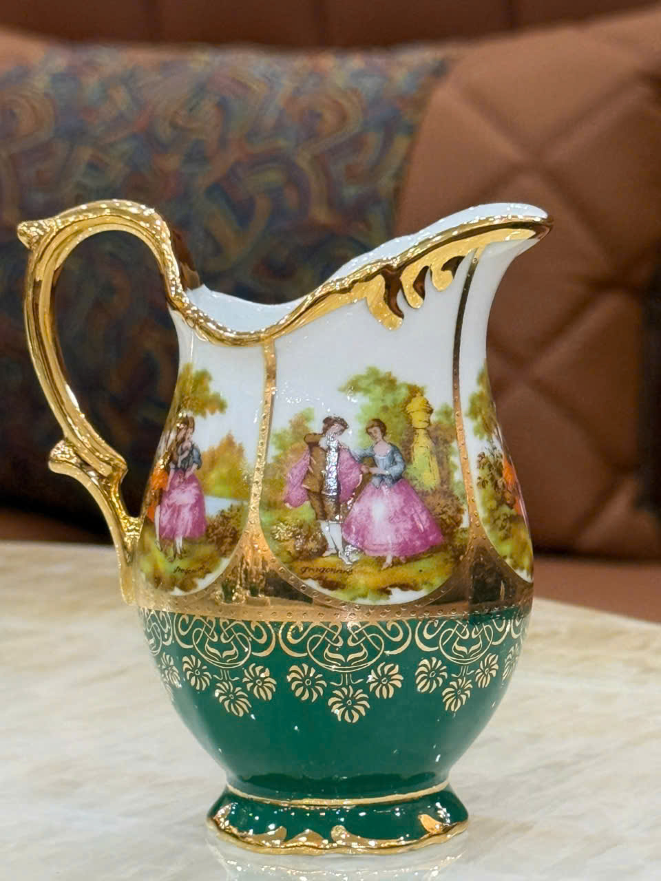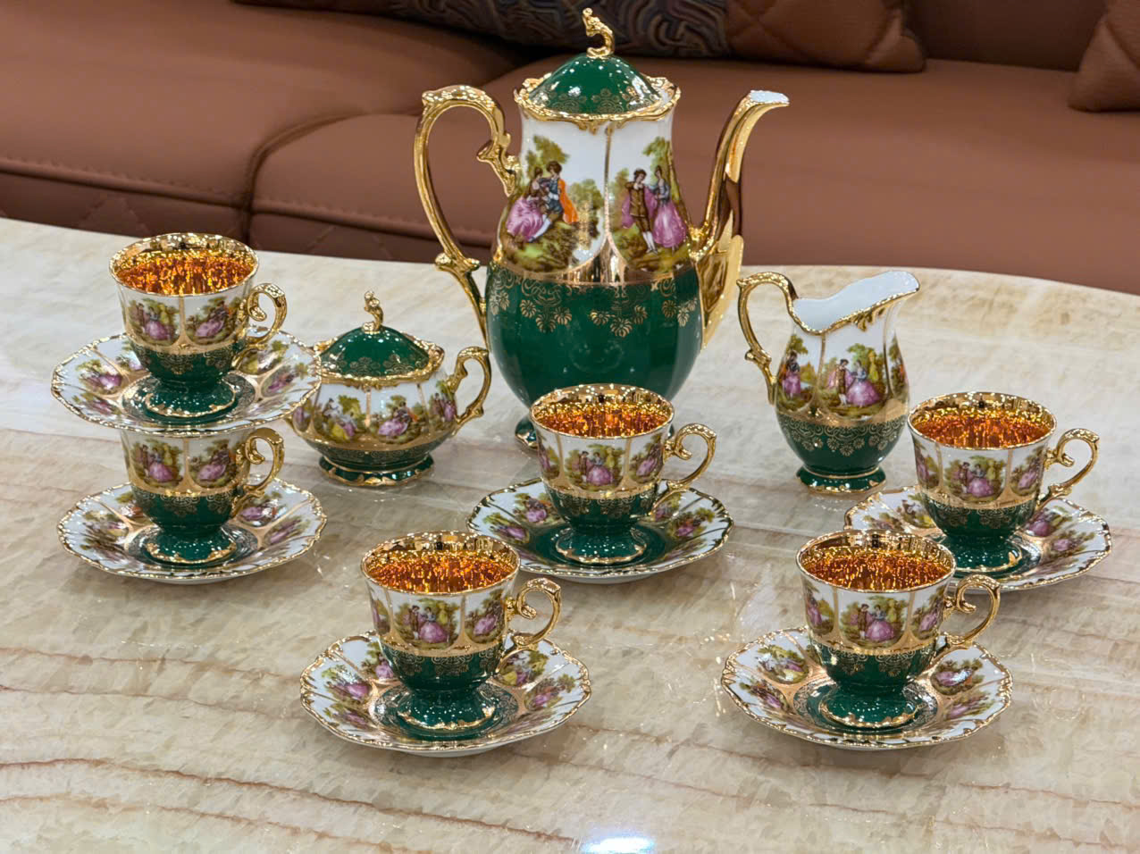 Bộ ấm chén trà trong hình là dòng sứ cao cấp phong cách châu Âu, nổi bật với gam màu xanh lá  kết hợp trắng ngà và viền vàng ánh kim tinh xảo, mang lại vẻ đẹp sang trọng, quý phái cho không gian tiếp khách, phòng trà hoặc làm quà biếu tặng cao cấp.