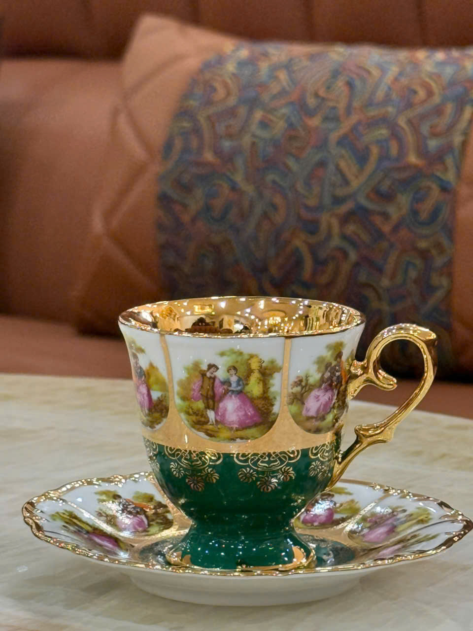 Họa tiết tranh cổ điển được thể hiện sắc nét, mềm mại, tạo cảm giác hoài cổ và nghệ thuật. Lớp men bóng mịn giúp sản phẩm luôn sáng đẹp theo thời gian. Phần viền vàng ở miệng ấm, tay cầm và đĩa lót được xử lý tỉ mỉ, làm nổi bật giá trị thẩm mỹ của toàn bộ sản phẩm. Lòng chén tráng men ánh vàng tạo cảm giác ấm áp khi thưởng trà.