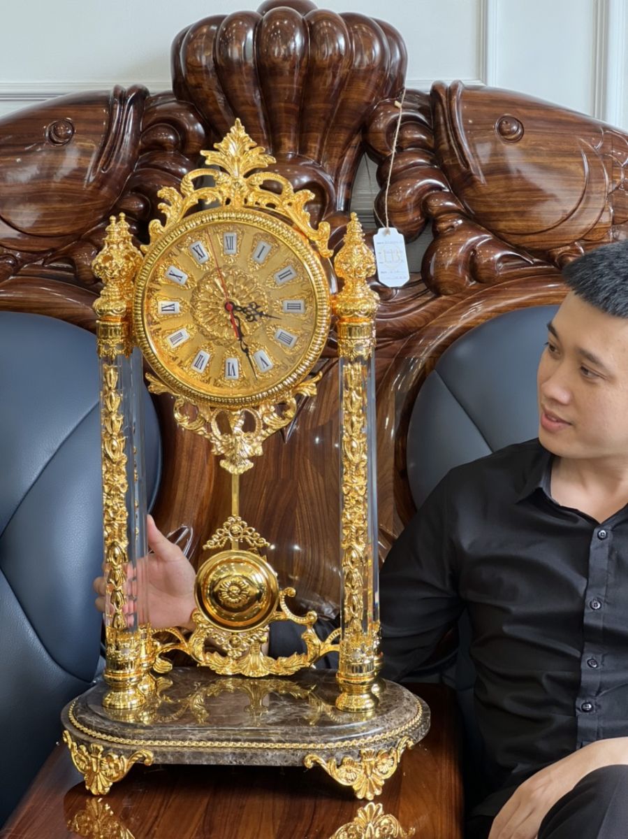 Thiết kế sang trọng và đẳng cấp bởi chất liệu mặt đồng hồ được mạ vàng, điểm chữ la mã cổ điển nổi, có 2 cột phale phong cách mới lạ mắt. Đồng hồ để bàn quả lắc chuyển động, chạy pin, kim trôi tĩnh âm và không đánh chuông. Mẫu đồng hồ mạ vàng sẽ giúp những khoảng trống của không gian thêm phần mới mẻ và sang trọng hơn.