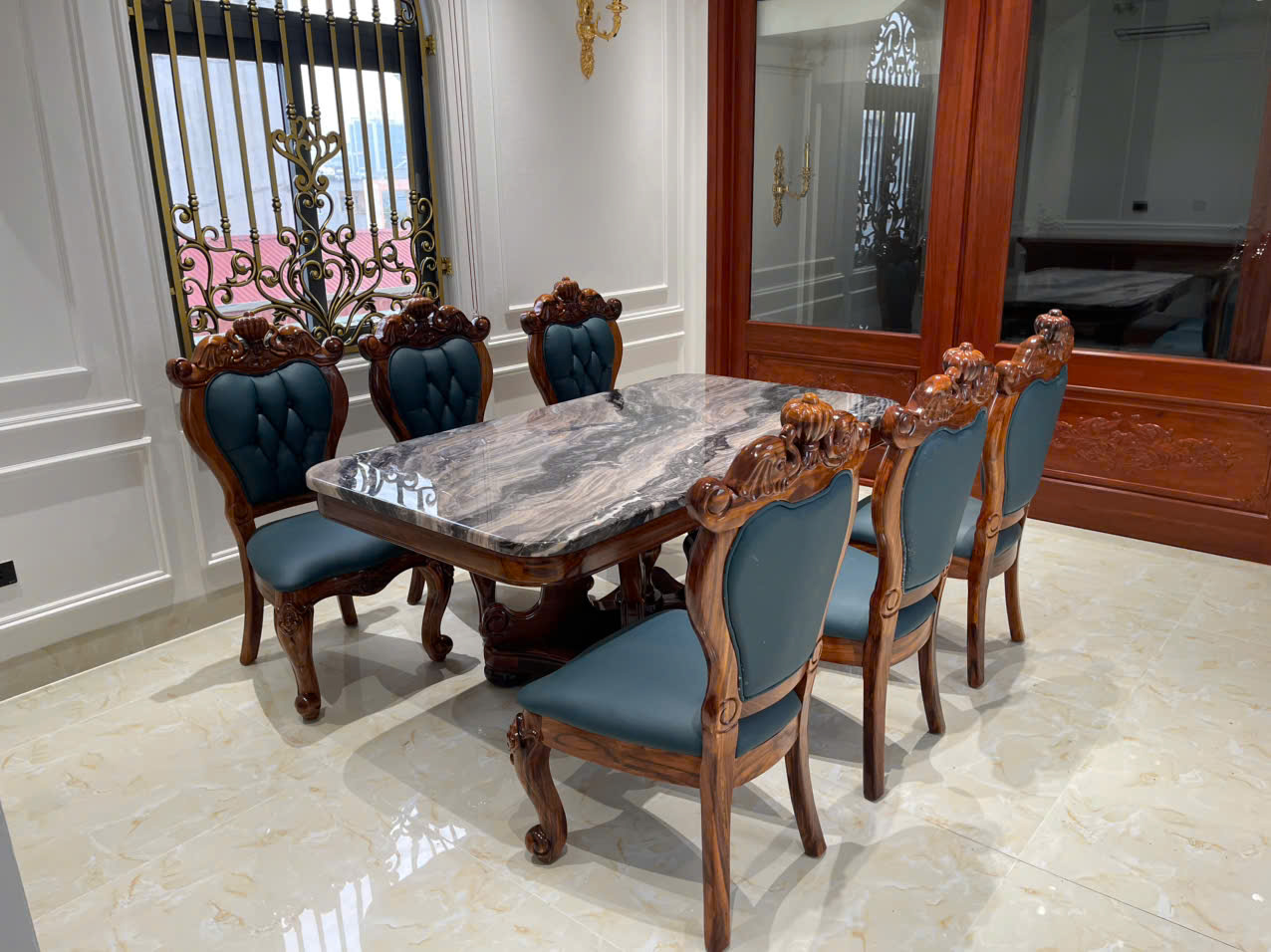 Nội thất phòng ăn phụ nhà chị tầng 6 thiết kế theo tông màu gỗ cực chất: bàn ăn 1,8m mặt đá nhân tạo + 6 ghế bọc da bò gam màu xanh. Chất liệu khung gỗ mun Nam Phi có độ bền lên tới 20 năm. Chất liệu da bò tót dày lớp 1 nguyên miếng nhập khẩu ý êm – bền – thẩm mỹ cao.