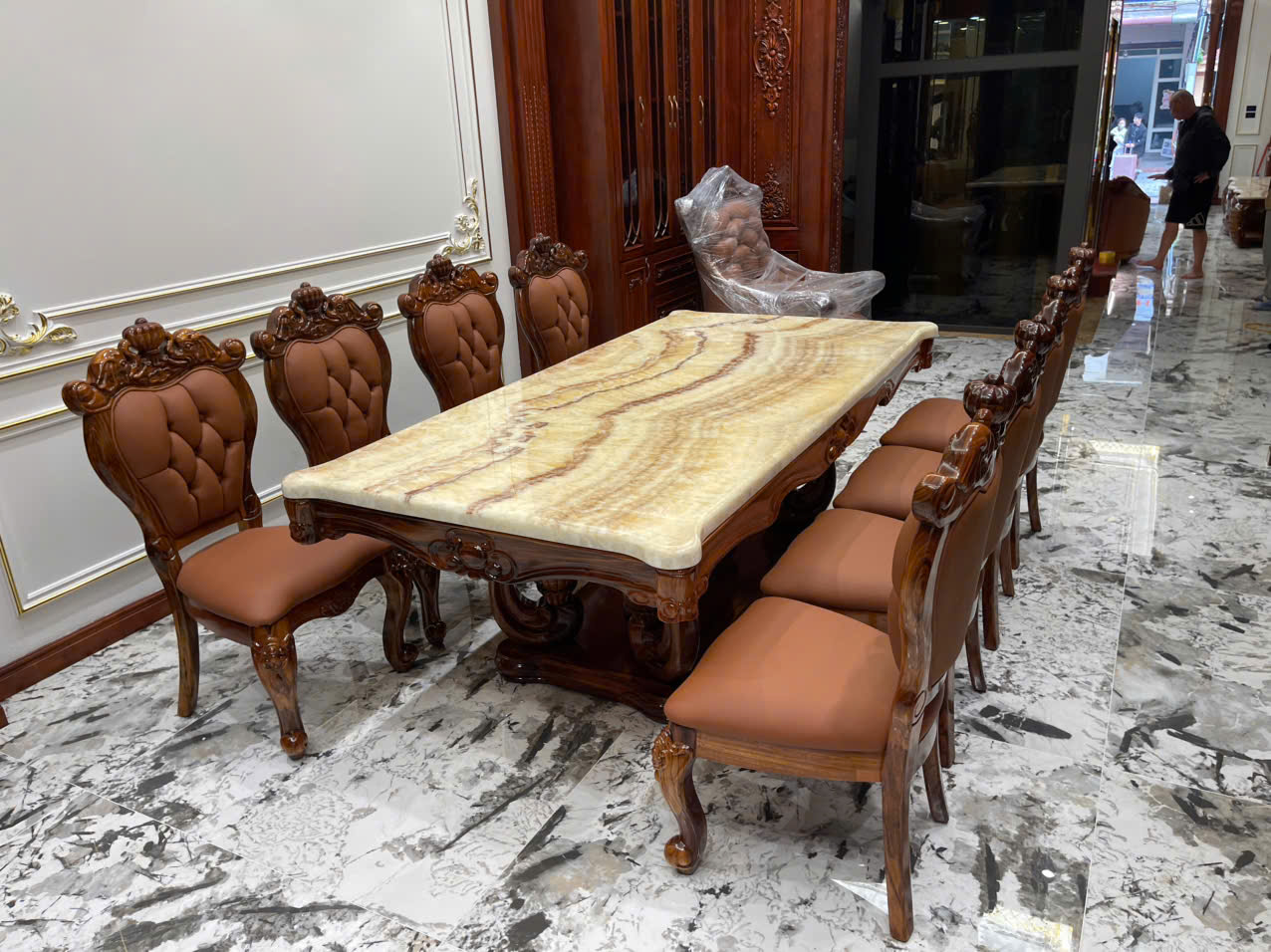Nội thất phòng ăn chính nhà chị tầng 1 thiết kế theo tông màu gỗ cực chất: bàn ăn 2,4m mặt đá Long Hồng Ngọc tự nhiên + 8 ghế bọc da bò gam màu cam đất ( có thể để được 10 ghế ăn). Chất liệu khung gỗ mun Nam Phi có độ bền lên tới 20 năm. Chất liệu da bò tót dày lớp 1 nguyên miếng nhập khẩu ý êm – bền – thẩm mỹ cao.