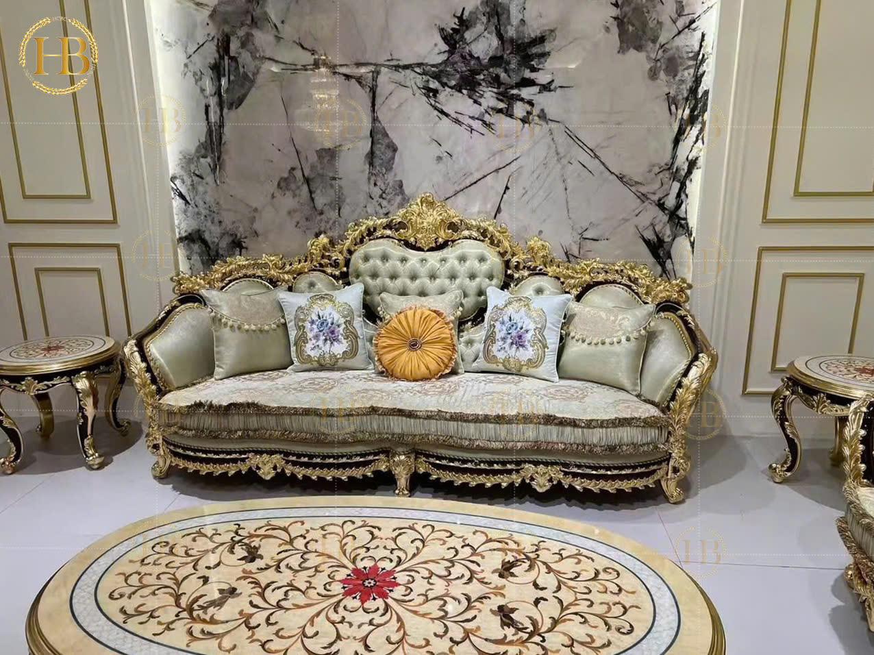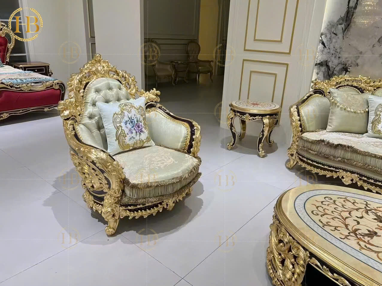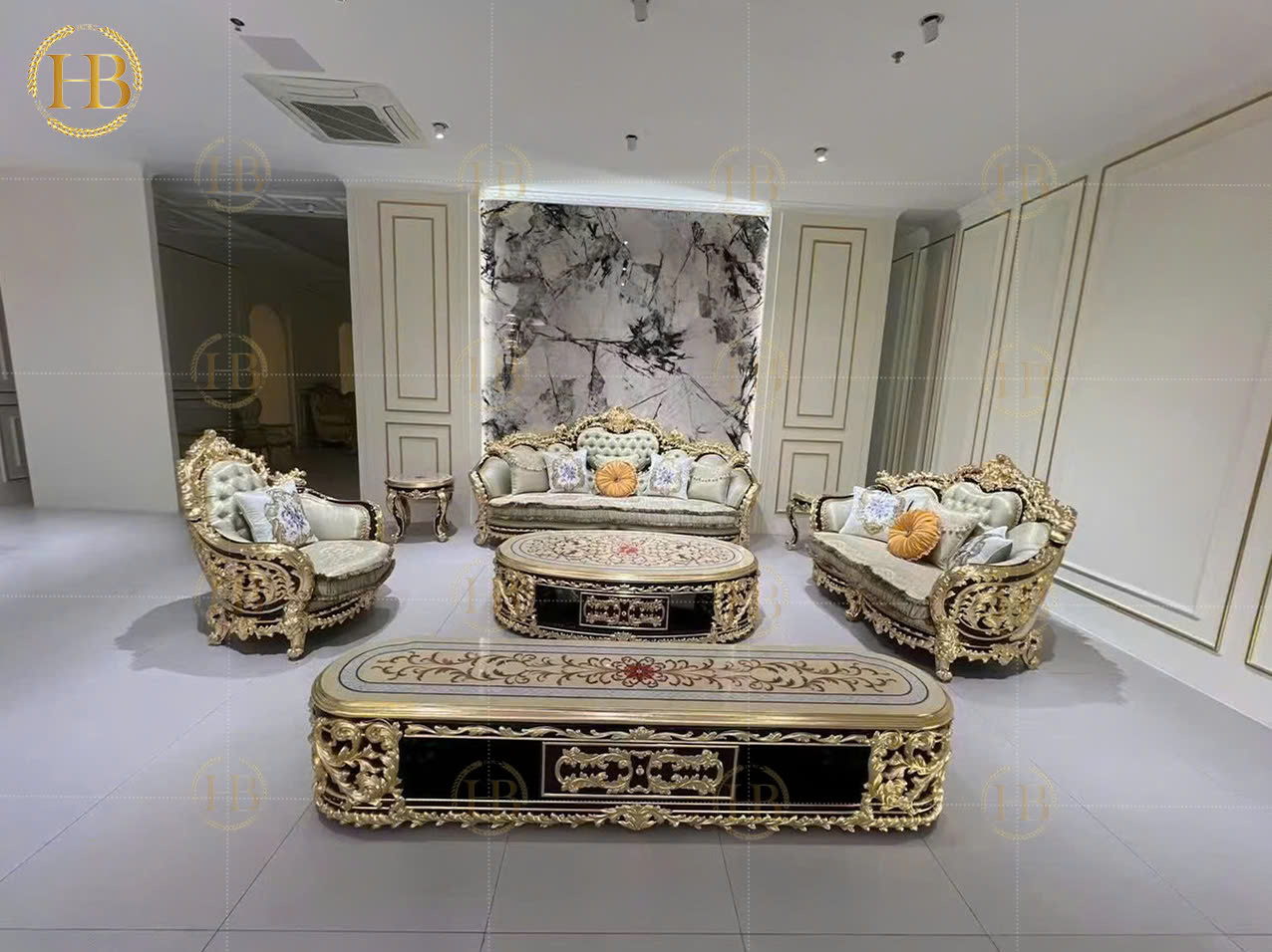 Sofa hoàng gia dát vàng 24K là tuyệt tác nội thất dành cho không gian thượng lưu. Thiết kế tân cổ điển tinh xảo, chạm khắc thủ công sắc nét, phủ lớp vàng 24K cao cấp tạo nên vẻ đẹp lộng lẫy, bền bỉ theo thời gian.